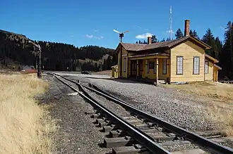 The railroad line was built in the early 1880s by the Denver & Rio Grande Railroad as part of its San Juan Extension from Alamosa to Durango, Colorado. The railroad has a steep (for a railroad) 4% grade approaching from the west, so additional helper locomotives were usually run (and often still are) on trains from Chama, New Mexico to Cumbres Pass. The facilities at the pass were built by the railroad to support the turning of the helper locomotives for their return to Chama, and provide water to locomotives after the climb. Some of the structures at the pass, including the station building, were demolished when the highway was realigned. Regular passenger service was provided by the San Juan Express, running from Alamosa to Durango, which was discontinued in 1951, although numerous rail-fan specials operated over the line until September 1967.[2] Freight service on the line ended in 1968 and since 1970 the railroad from Chama to Antonito has been owned and operated by the Cumbres and Toltec Scenic Railroad, which operates trains over the pass during the tourist season. The original section house, car inspectors house, and part of the old snowshed remain on Cumbres Pass and are maintained by the Friends of the Cumbres and Toltec Scenic Railroad. At present, no one lives at the summit of Cumbres Pass, though when the railroad operated as a common carrier line, railroad personnel were stationed at the pass full-time.