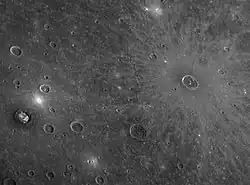 Cunningham is a young crater on the western floor of the Caloris Basin, on Mercury. It is surrounded by a bright ray system.