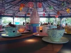 Mad Tea Party is a spinning tea cup ride at five of the six Disneyland-style theme parks around the world. The ride theme is inspired by the Unbirthday Party scene in Walt Disney's Alice In Wonderland, and plays a carousel version of the film's "Unbirthday Song". It was one of the opening day attractions operating at Disneyland on July 17, 1955.[3]