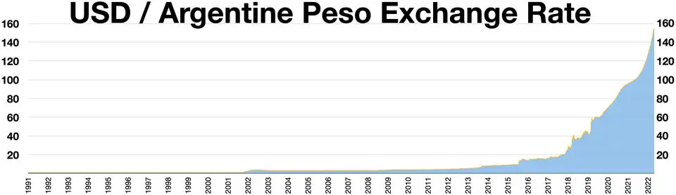 The official exchange rate for the United States dollar valued the peso convertible de curso legal at one US dollar at its introduction in 1992, which was maintained until early 2002. Afterwards, it went from a 3:1 exchange rate with the US dollar in 2003 to 178:1 in early 2023. On 14 August 2023, the official exchange rate was fixed at ARS$350 to one US dollar; the unregulated rate valued the peso at ARS$665 to one US dollar.[5] On 15 November 2023, the crawling peg was restored.[6]