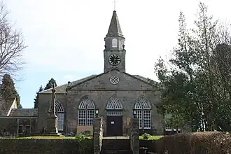The parish church lies south of the current main road, amongst a small cluster of buildings which represent the original village. It was built in a simple rectangular form, with a pediment on its north (entrance) side and a low central spire, in 1784 by James Thompson of Leith. Its interior was remodelled in 1835 by the Edinburgh architect, David Bryce, and in 1848 the windows were enlarged by the architect David Cousin. As the graveyard pre-dates the church it is presumed that the church replaced an earlier church.[6]