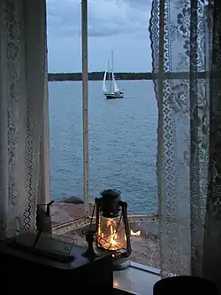 A sheer or net curtain is one that is made from translucent fabric, such as a loosely woven polyester voile, silk or nylon made marquisette or ninon, and cotton lace, etc.[8][9][10][11][12] Sheer curtains allow a majority of light to be transmitted through the fabric, with the fabric weave providing a basic level of UV protection while retaining maximum visibility outward through the curtain. Sheer curtains are sometimes referred to as "privacy curtains" in reference to their screening abilities; during the day most sheer fabrics will allow people inside the home to see the outside view while preventing people outside the home from seeing directly into the home. Due to the loose weave in sheer fabrics, these types of curtains offer very little in the way of heat insulation.