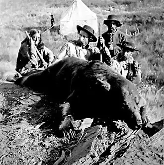Custer and his force entered the Black Hills from the north, travelling south at a slow pace of no more than four or five miles a day on some occasions.[3] On July 31, 1874, the wagon train reached Harney Peak (now Black Elk Peak), and Custer together with Ludlow took three or four men to climb it.[5] In the meantime, the rest of the expedition made camp at the mountain's base at the newly named Custer Park.[6] While the majority of the force remained there, Custer took a small unit with him to locate a suitable site for a new fort. By August 2, 1874, this force had reached a point eight and a half miles south-east of the mountain,[7] to a location they named Agnes Park,[8] having had a number of peaceful encounters with Native American settlements.[9] On August 7 Custer shot and killed a grizzly bear, forever claiming this to be his greatest achievement as a hunter.[8]