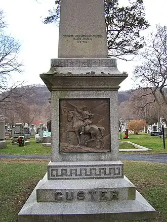 Custer Monument is a monument at the United States Military Academy Cemetery, in honor of Lieutenant Colonel George Armstrong Custer who was killed along with his immediate command at the Battle of the Little Bighorn on 25 June 1876. Congress approved of a statue, to be made from 20 condemned bronze cannons, and for $10,000, of which $6,000 had been subscribed by citizens of New York.[1] The monument was originally located near the academy's headquarters building near the site of present-day Taylor Hall along Thayer Road.