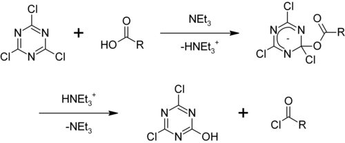 Cyanuric chloride is employed as a reagent in organic synthesis for the conversion of alcohols into alkyl chlorides,[8] and carboxylic acids into acyl chlorides:[9]