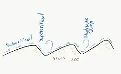 In density flows, antidunes can turn into cyclic steps by wave breaking.[12] Fluid flow is Froude-supercritical over the entirety of antidunes, whereas the flow alternates between the sub- and super-criticality over cyclic steps (with hydraulic jumps between cycles). Additionally, cyclic steps tend to have a much larger wavelength-to-flow-thickness ratio and a higher suspension index (ratio of shear velocity to sediment settling velocity). Antidunes are typically unstable (although they can be made stable in laboratory conditions), in contrast to cyclic steps. Despite these differences, it is not uncommon for researchers to incorrectly label a cyclic step as an antidune.[10] Cyclic steps also have similarities to chute-and-pool features. Like cyclic steps, chute-and-pool flows undergo hydraulic jumps,[12] although the flow does not undergo repeated transitions from sub- to super-critical. When the flow remains subcritical over the whole feature, ripples and dunes form instead.[10]