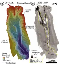 15. ^ Lamb, Michael P.; Parsons, Jeffrey D.; Mullenbach, Beth L.; Finlayson, David P.; Orange, Daniel L.; Nittrouer, Charles A. (2008-03-01). "Evidence for superelevation, channel incision, and formation of cyclic steps by turbidity currents in Eel Canyon, California". GSA Bulletin. 120 (3–4): 463–475. Bibcode:2008GSAB..120..463L. doi:10.1130/B26184.1. ISSN 0016-7606.