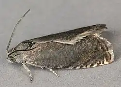 It is a small (15 mm wingspan), grey-brown moth whose larvae (caterpillars) feed in the pods of garden peas.[2] They have a long antennae (compared to the body size), and brownish grey wings with white and yellow spots in herringbone pattern on the edge.[3]