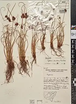 - ^ a b c Karen Wilson (27 September 1991). "Systematic studies in Cyperus section Pinnati (Cyperaceae)". Telopea. 4 (3): 474–475, Figs 26c, 27b, 28d-f. doi:10.7751/TELOPEA19914945. ISSN 0312-9764. Wikidata Q55800547.