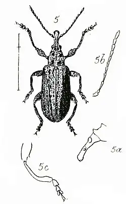 | Cyrotyphus fascicularis Pascoe, 1870 with a)lateral view of head, b)antenna and c}hindleg | |