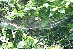 The red tent spider builds a large three-dimensional web in vegetation, which is a common feature of members of the genus.[5]