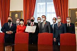 In early 2021, the Tricolour Citizens' Movement, Svobodní, the Freeholder Party of the Czech Republic, and other minor parties began negotiations about a potential alliance.[42] On 5 March 2021, these three parties confirmed the formation of a coalition, stating that they would run either in a formal electoral alliance or as a single party, depending on the new electoral law.[43] The Independence Party of the Czech Republic declared support for this coalition soon after.[44] On 23 March 2021, Tricolour leader Václav Klaus Jr. resigned from all political functions for personal reasons.[45] Zuzana Majerová Zahradníková became acting leader of the party.[46]
