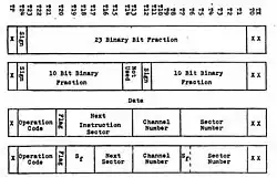 The computer uses a full 24-bit instruction word and data word. Data is represented in one of two fashions, as a 23-bit binary fraction (full word) or as a 10-bit fraction (split word). The two formats are shown in the figure. Instructions also have two formats, either flagged or unflagged as indicated in the figure. A list with all of the available instructions with numeric and mnemonic codes follows. For more information on programming see: