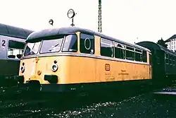After its retirement on 21 June 1963, having clocked up 1,236,000 kilometres, the Uerdingen railbus VT 95 906, one of the original prototypes of its class, was converted in the repair shop (Ausbesserungswerk or Aw) at Kassel into a test vehicle for Indusi railway installations. Designated as 6205 Wt it began its new duties on 25 February 1964 at Bahnbetriebswerk (Bw) Wuppertal and replaced the measurement draisine previously used for this task. On 1 January 1968 it was given the number 724 001–3. The installation of testing magnets on both sides of the vehicle in 1971 considerably improved its utility, making it possible to test station entry and exit signals in one pass. Number 724 001 was retired on 18 January 1986 at Bw Heidelberg. Since then the vehicle was left by itself for many years and eventually stood in a very dilapidated state in front of Worms locomotive shed. In 2007 the railbus was bought up by the Vulkaneifelbahn and taken away to Gerolstein, where the intention is to restore it in the medium-term.