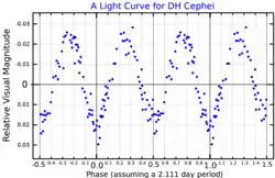 In 1949, Joseph Algernon Pearce derived the orbital elements for DH Cephei (then known as HD 215835) and predicted that the binary pair would show eclipses, although he had no data to prove that.[13] Graham Hill et al. confirmed the predicted variability of star's brightness, in 1976.[14] Although initially suspected to be an eclipsing binary and given a variable star designation,[8] it doesn't appear to be eclipsing.[3] Instead, the system displays ellipsoidal light variations that are caused by tidal distortions.[7]