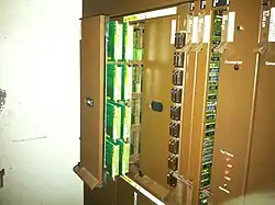 The CPU contains two identical 16-bit processors running in hot standby mode. The original CPU core was referred to as the NT40 CPU and was implemented in approximately 250 discrete logic devices across several circuit boards running at 36 MHz. The NT40 core consisted mainly of the NT1X44 stack card, which provides some register and stack functions of the processor, the NT1X45 which contained the arithmetic and logic functions, the NT1X46 which provides more registers and the load-route read-only memory (ROM) and the NT1X47 timing and control card which provides the micro-cycle source and microstore decoding functions of the processor.[2] The NT1X47 card also contained the 2-digit hexadecimal display to indicate test result codes and the condition of the core. The NT1X48 processor maintenance card contained a thumbwheel on the faceplate to enable various diagnostic tests of the CPU. A later modification of these same five circuit boards with faster pin-compatible discrete logic devices enabled the CPU to operate at 40 MHz allowing central offices to improve call throughput capacity by 10 percent.[3] When the CPU is configured in dual hot standby mode, a mate exchange bus (MEB) between the two CPUs enables the state of one CPU to be continuously compared to that of the other CPU on a cycle by cycle basis. Any discrepancy between the two CPUs results in maintenance circuitry determining which CPU is at fault and activity to change to the same CPU.