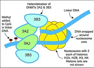 The three DNA methyltransferases (DNMT3A1, DNMT3A2 and DNMT3B) catalyze reactions placing a methyl group onto a cytosine, usually at a CpG site in DNA.[23] The accompanying Figure shows a methyltransferase complex containing DNMT3A2. These enzymes, to be effective, must act in conjunction with an accessory protein (e.g. DNMT3B3, DNMT3L, or others).[24][25][26] Two accessory proteins (which have no catalytic activity), complexed to two DNMTs with a catalytic domain, occur as a heterotetramer (see Figure). These heterotetramers occur in the order: accessory protein-catalytic protein-catalytic protein-accessory protein. The particular complex shown in the Figure illustrates the heterotetramer formed by catalytic protein DNMT3A2 and accessory protein DNMT3B3. One accessory protein of the complex binds to an acidic patch on the nucleosome core (see top 3B3 in Figure). The connection of one accessory protein to the nucleosome orients the heterotetramer. The orientation places the first catalytic DNMT (closest to the accessory protein connected to the nucleosome) in an intermediate position (not close to the linker DNA). The second catalytic DNMT (lower 3A2 in Figure) is placed at the linker DNA. Methylations can take place within this linker DNA (as shown in the Figure) but not on any DNA wrapped around the nucleosome core.