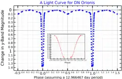![]() A near-infrared (y band) light curve for DN Orionis. The main plot shows the variation over a full orbital period, and the inset plot shows the time near maximum eclipse. Adapted from Etzel and Olson (1995)[1] | |