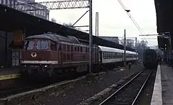 During GDR times the class 132 pulled everything that was fast or heavy such as express trains on non-electrified lines or coal or lime trains of 1800 to 2200 tonnes in weight. Due to the higher axle load and weight their use was not as flexible as the DR Class 118 and DR Class 119.
