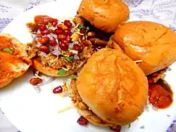 | Main ingredients | Potatoes, masala, pav (burger bun), pomegranate, peanuts |