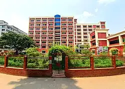 The campus is located at Mitford road, Babubazar, Old Dhaka, the historic old part of Dhaka city.[12] It is spread over about 2.8 acres of land, on the bank of Buriganga river.[13] The medical college building is situated to the south-east of the hospital area, near the river bank with a large garden in front.[14] The building is four-storeyed with a floor space of 4,940 square meters on each floor. The building accommodates the Departments of Anatomy, Pathology, Biochemistry, and Microbiology. The Departments of Physiology, Pharmacology, Community Medicine, and Forensic Medicine are housed in another building in front of the main building.[7]