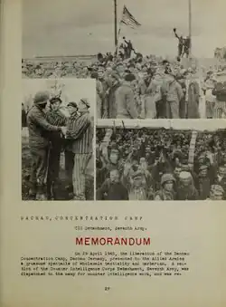 The 649th Engineer Topographic Battalion of the U.S. Army took over the printing and duplication of the report, which was published in typewritten form.[17] By May 1945, 10,000 copies had already been circulated.[9] The Dachau Report was, according to the memoirs of William W. Quinn initially intended only as an internal report for use in the US Army, but then got to journalists unplanned through display in a press room, making it known to the public.[18] It soon circulated among US soldiers and members of the press.[10][19]