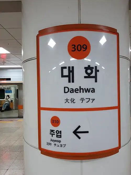 Daehwa Station (Station 309; Korean: 대화역) is an underground metro station on the Seoul Subway Line 3, operating as an extension of Line 3 of the Seoul Subway, in Daehwa-dong, Ilsanseo District, Goyang, South Korea. The station is Line 3's northwestern terminus and its 6 exits offer access to, among other places, KINTEX (750 m from Exit 1). Travel time from Daehwa to Seoul Station, changing to Line 1 at Jongno 3(sam)-ga, is 1 hour and 2 minutes, while traveling the full length of Line 3 to Ogeum takes 1 hour and 36 minutes.