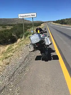 It was named for the farm Daggaboersnek, which up to 1752 was known as Knapzakfontein.[2] The pass has been in regular use since the 19th century, and a blacksmith, trading post, police station and small hotel were established there. The voortrekker Louis Tregardt for a time (c.1814–1820s) farmed in its vicinity, as did Piet Retief on the northern approach to the crest.[3] In 1837 Benjamin D'Urban determined that the boundary between districts Cradock and Somerset would run over Daggaboers Nek.[4] The 8th Frontier war (1850–1853) took place in the general area,[2] and on old year's eve 1851, deserters from the Cape Corps ambushed and killed two young men, Henry and Edward Trollip, at Sunnyside farm near the nek.[5] The Trollips were British Settlers whose graves can still be seen here, the earliest dating to 1856.[3]