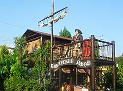 This 27-storey recreational complex is the most prominent building of Dagomys raised in 1982. It then belonged to the Intourist travel agency and thus was restricted to foreign visitors. With the dissolution of the Soviet Union in the 1990s, the complex became nearly empty. Since 1994, Dagomys has been administered by an office of the President of the Russian Federation, and the complex is privately owned.[9] For several years, it was the subject of property disputes,[10] which ended by construction of a metal fence dividing the territories of the disputants.
