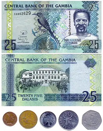 ![]() 25 dalasi note and coins from 5 bututs to 1 dalasi | |