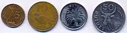 In 1971, coins in denominations of 1, 5, 10, 25 and 50 bututs and 1 dalasi were introduced. The 1 and 5 bututs were struck in bronze while the 10 bututs were brass and the 25, 50 bututs and 1 dalasi were cupro-nickel. The reverse designs of the three higher denominations were taken from the corresponding denominations of the previous currency (1, 2 and 4 shillings), with the reverse designs for the lower three coins coming from the 6, 1 and 3 pence coins, respectively. All coins of this series depict former president, Sir Dawda Jawara.
