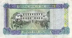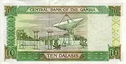 | | 10 Dalasis | Green | Sacred ibis; boy | Central Bank of The Gambia headquarters, Banjul | 2006 |