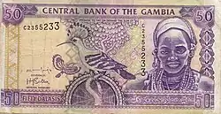 | 50 Dalasis | Light purple | Hoopoe birds; President Yahya Jammeh | Wassu stone circles | 2015 | ||