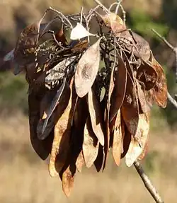 There is some variation between East African plants and the typical South African form: The leaflet-apices of East African specimens are less frequently pointed, there are few lateral nerves, and the fruits are generally relatively narrower and less hairy.[4] Some of the specimens from southern Mozambique show a cline towards the East African form, and so no formal taxonomic distinction seems necessary between Eastern and Southern African forms.[4]