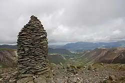 The summit is marked by a cairn standing on the brink of the northern face. There is a fine end-on view of the Newlands Valley to the north, backed by Skiddaw. All around are rank upon rank of fells, of the major Lakeland ranges only the High Street group not being fully visible.[4][5]
