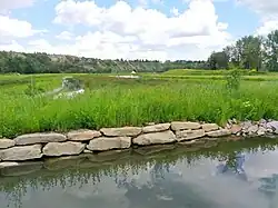 The water moves slowly through meandering man-made side streams in the polishing marsh area where wetland plants remove finer particles.[14] The water flows through "cells" in the park "stopping at various river banks" that "polish" the water before it enters the Bow River.[7] The design for the park was a collaboration by O2 Planning + Design, Source 2 Source Inc., and led by Sans façon for Watershed+.[4] According to the February 2014 East Bowmont NEP Design Development Plan, the collaborators for the landscape design alongside the stream in part drew their inspiration from the "unique riparian phenomenon" known as anabranches, or "meander[ing] scrolls,[15]: 99 which are sections of streams that divert from and then rejoin the main channel of a watercourse.[15]: 99 Thousands of trees, bushes and native plants were planted and seeded as part of the restoration process using phytoremediation to treat the contaminated soil from the gravel pit.[15]: 5 [Notes 2]