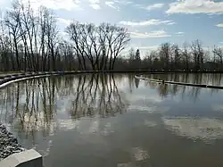 The design includes a Nautilus Pond, a polishing marsh, a wet meadow, a stream, outfall, a dry stream, riparian areas, and a lookout mound.[13][14] The polishing marshes, wet meadow, and a surface stream carry the stormwater from the Nautilus Pond to the polishing marshes. The stream also collects the wet meadow stormwater and "conveys it to the outfall".[14] The lookout knoll is encircled by the marsh with sedge and willows growing nearby.[14] Residential snow and rain runoff travels through pipes then resurfaces in the Nautilus Pond which is located at the west of the Park. Large sediment particles are removed in the pond draining system which "swirls the water before dropping it down a halo drain".[7]
