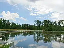 A City of Calgary press release described the Park as a "one-of-a-kind", "beautiful stormwater treatment facility" that filters and treats stormwater through a combination of natural and man-made processes.[5] One of the main focuses of the project was to improve the underground storm drain system of stormwater collected from eight northwest communities, including Silver Springs and Varsity.[4] Before the creation of Dale Hodges Park, stormwater from these communities, representing nearly 1,800 hectares (4,400 acres), ran through underground storm drains in the gravel pit, directly into the Bow River.[7] According to a June 26, 2019 City of Calgary press release, Dale Hodges Park "is one of a kind in North America in the way that it is designed to handle and filter the stormwater...The park's proximity to the river presented a rare and unique opportunity to protect the Bow River ...as it is estimated that the annual sediment loads to the Bow River from this area will be reduced by 50%."[8]