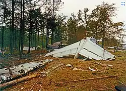 On April 4, 1977, near the site marker for the Battle of New Hope Church, the forced landing of Southern Airways Flight 242 occurred. The passenger jetliner, a McDonnell Douglas DC-9 with 81 passengers and 4 crew members, was flying from Northwest Alabama Regional Airport to Atlanta Municipal Airport. Upon descending in altitude to prepare for landing in Atlanta, the jetliner started to fly through an intense thunderstorm near Rome, Georgia. Because of the extreme amounts of water and hail that were ingested by the jet's engines, both of the Pratt & Whitney JT8D-7A turbojet engines were damaged and underwent flameout.[12][13] With the engines unable to restart, the flight's crew began gliding in hopes of reaching a nearby airport. Upon finding out that there were no nearby airports to perform a landing, the crew found a straight section of rural road in Dallas, Georgia to try and land. As the plane began to land, it clipped a gas station, convenience store, and other buildings, resulting in the plane to lose control of landing and ultimately crash, resulting in hull loss. Both pilots and 61 passengers were killed by impact forces and fire. Nine people on the ground were also killed.[14]