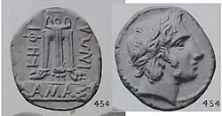 The city and its silver mines were most likely captured by Philip II of Macedon after he defeated Illyrian king Bardyllis.[18][19] At the time of Alexander the Great's Balkan campaign, in particular in Illyria, the autonomous minting of Damastion ceased, meanwhile Macedonian coins of Alexander and his father Philip II appear in the region, suggesting that the kings of Macedon have set up a unified monetary system by capturing all the metal resources available in the region.[20]