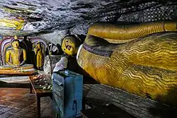 Dambulla cave temple (Sinhala: දඹුල්ල රජ මහා විහාරය, romanized: Dam̆būlla Raja Maha Vihāraya; Tamil: தம்புள்ளை பொற்கோவில், romanized: Tampuḷḷai Poṟkōvil), also known as the Golden Temple of Dambulla, is a World Heritage Site (1991) in Sri Lanka, situated in the central part of the country.[1] This site is situated 148 kilometres (92 mi) east of Colombo, 72 kilometres (45 mi) north of Kandy and 43 kilometres (27 mi) north of Matale.