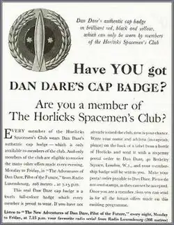 The New Adventures of Dan Dare, Pilot of the Future aired five times a week on Radio Luxembourg for five years from 2 July 1951. Dan's voice was Noel Johnson, who also played Dick Barton on BBC radio.[12] Each episode started with the command "Spaceships Away!". The 15-minute show was sponsored by Horlicks and on 3 March 1952, the 106th episode of Dan Dare was heard that Monday night with different episodes on Tuesday, Wednesday, Thursday and Friday at 7:15pm. Although the dramatisation was recorded on wax discs for broadcast, the original discs were lost or destroyed.[13] Until recently no copies had ever been recovered but in late 2011 two episodes were found as part of the Lost Shows Appeal, orchestrated by missing episode hunter Charles Norton. The recovered shows were "Under Sentence of Death" (episode 76), aired on 21 January 1952, and "The Lost World On Mars" (episode 53), aired on 19 March 1953.[14]