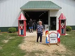• The Danebod Gym Hall was erected in 1904 and is a cruciform clapboard building. The two sides of the entrance arm project forward to the eaves, and the sides plus a small roof enclose the entrance.[4] It was originally built as a space for Danish gymnastics, folk dancing, music, theatrical performances, larger social gatherings, and worship for the Folk School students and other locals. Every year in the Gym Hall, the Danebod Lutheran Church upholds the Danish tradition of dancing around the Christmas tree. The basement is also commonly used for crafts such as stained glass and woodworking.[38] In 1928 it was enlarged with a stage, basement and furnace. Many home talent plays were presented there, and it is still used for an occasional play, and is also used by the camps and retreats for folk dancing. Points of interest are the statue with an original canvas curtain with advertising, bars used years ago by gymnasts (on the south wall), and the original wainscoting on the walls.[37]