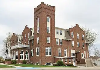 • The Danebod Folk School was first built in the year 1888, but it burned to the ground on February 25, 1917. It was soon rebuilt, and nine months later the current school building was completed. A three-story brick building, it has gable ends carried up as parapets. The four-story crenelated corner tower and the pointed arches at the entrance are from Gothic and native Danish architecture.[4] The Folk School was renovated in 1946 and is now used by the Danebod Lutheran Church for camps and retreats, and as a meeting place for local groups and clubs. Points of interest are the hand-carved podium in the lecture hall, the picture behind the podium, the hand-carved wooden cross on the podium, collection plates made by Dr. Thomsen, and also the statuary in the lecture hall and sitting rooms, pictures in the sitting rooms, and the small podium in the dining room.[24] Early settlers of the colony founded a residential school in the Danish tradition of folk High Schools and fostered the concept of "learning for living", by which individuals sought to become enlightened and thoughtful citizens. The Folk School Building stands as a testament to these values, and continues to serve as a place for fellowship and lifelong learning. Each dormitory style room is unique in plan and decoration. A large kitchen and dining area provide a perfect setting for group meals and activities. A lecture hall and several classrooms allow ample space for programming.[38]