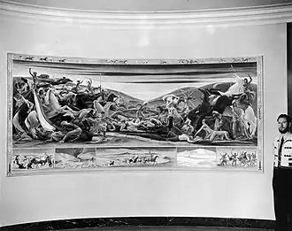 Mechau arrived for the installation with documentation about scalping techniques and, according to art historian Marling, "Indian preferences in the matter of costuming appropriate for victims".[4] The painting was installed in September 1937, after which Bureau of Indian Affairs commissioner John Collier ridiculed Rowan's and Mechau's earlier statements defending the depictions, calling the painting "a slaughter against pioneer women".[1][4] Washington's Evening Star, without mentioning the nude women, immediately called the mural "Art at its Worst", said it had "shocked all who have seen it", accused "government doles" of "foster[ing]...radicalism in art", and accompanied its review with a recounting of Phoebe Atwood Taylor's Octagon House, a story of a town so scandalized by an offensive post office mural that members of the community broke in after hours and painted over it.[4]