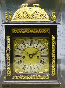 Wood gives an account of a watch made by Quare for James II, but the references are inaccurate.[4] Quare is also said to have made a repeating watch for William III. He certainly made a very fine clock for the king, which went for a year without rewinding. Being specially made for a bedroom, it did not strike. The clock still stands in its original place, by the side of the king's bed, in Hampton Court Palace, and shows sundial time, latitude and longitude, and the course of the sun. In 1836 the clock was altered by Benjamin Lewis Vulliamy, the equation work being disconnected and partly removed, a new pendulum provided, and the clock fitted with a deadbeat escapement. The case is surmounted by five well-modelled gilt figures, the complete height being over ten feet. The going train is similar to another year clock made by Quare.[5] F. J. Britten says of it: "It seems almost incredible for 81 lb. × 4 ft. 6 in. to drive the clock for more than 13 months, but everything was done that was possible to economise the force. The very small and light swing wheel, the balanced minute hand, and the small shortened arbors with extra fine pivots, all conduce to the end in view." The weight in the Hampton Court clock was still less, being only 72 lb. There is also at the Royal Hospital, Greenwich, a very curious clock by Quare with a double pendulum.