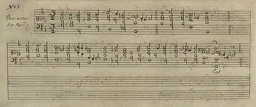 - Ich will dem Herren singen so lang ich lebe, motet for double SATB choir, dedicated to Johann Schelle. The manuscript consists of vocal parts, copied in 1701, the year Schelle died.[17]