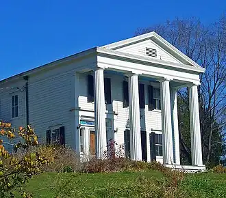The south (front) facade has four fluted Doric columns. A plain frieze runs around the main block's roofline. The main entrance, on the west end, has sidelights and a transom surrounded by flat pilasters supporting the cornice above it. A single raised panel is above both front windows. All windows have louvered shutters.[1]