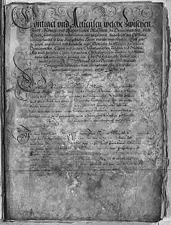 Crappe had sailed on the scouting freighter Øresund one month before the main fleet. Øresund had attacked Portuguese vessels off the coast of Karaikal and was himself sunk, with most of the crew killed or taken prisoner. The heads of two crew members were placed on spikes on the beach as a warning to the Dano-Norwegians. Crappe and 13 of the crew had escaped the wreck, making it to shore where they were captured by Indians and taken to Raghunatha Nayak, the Nayak of Tanjore (now Thanjavur in Tamil Nadu).[16][17] The Nayak turned out to be interested in trading opportunities, and Crappe negotiated a treaty granting them the village of Tranquebar (or Tharangamabadi),[18] the right to construct a "stone house" (Fort Dansborg), and permission to levy taxes.[19] This was signed on 20 November 1620.[20]