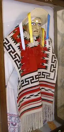 A Danzante wears a top and bottom made out of a white blanket. It is topped with a "sarape," which is a blanket worn as a cloak in Latin America. Each sarape contains different designs and colors. They wear a hat made out of straw with adorned lengthy pieces of ribbon, each one a different color. The ribbon is parted down the middle of the hat, each one hanging 10 cm on the sides. Their shoes are sandals that have a wooden sole in order to make a tapping noise throughout their dance, followed by a wooden cane they also use. The dancers also wear a mask made out of either wood, cornstalk paste, or clay with an elderly man's face painted on it.